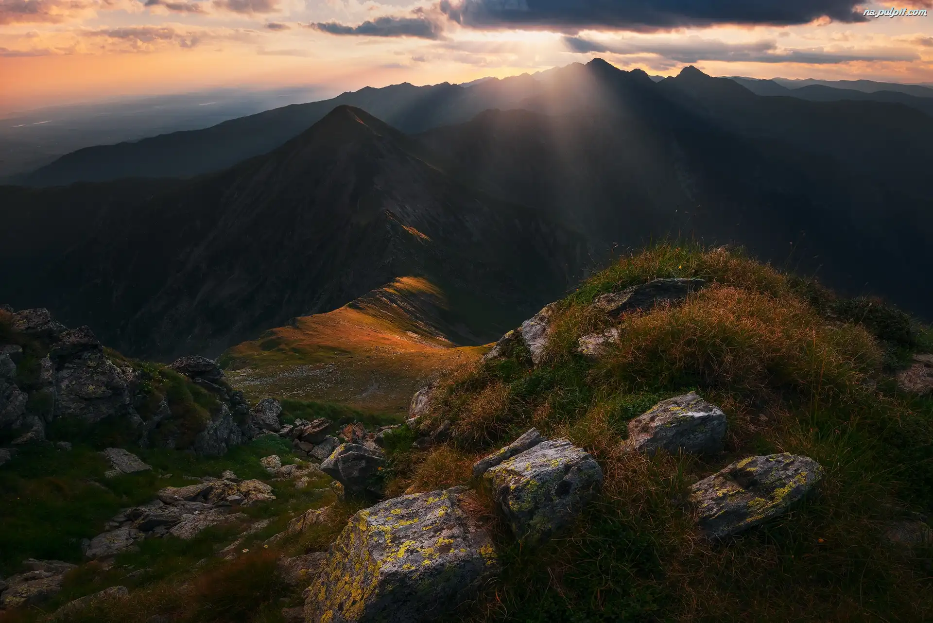 Wschód słońca, Skały, Góry, Trawa Na Pulpit