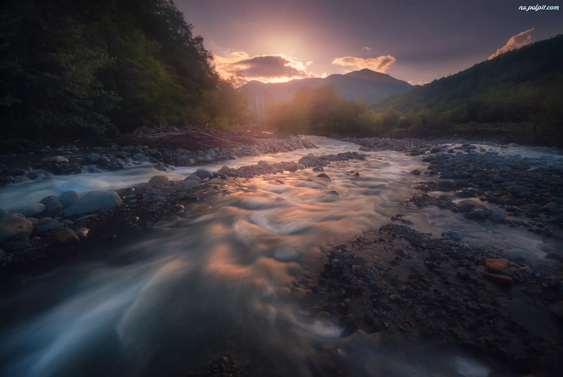 Kamienie, Wschód słońca, Góry, Drzewa, Rzeka, Chmury Na Pulpit
