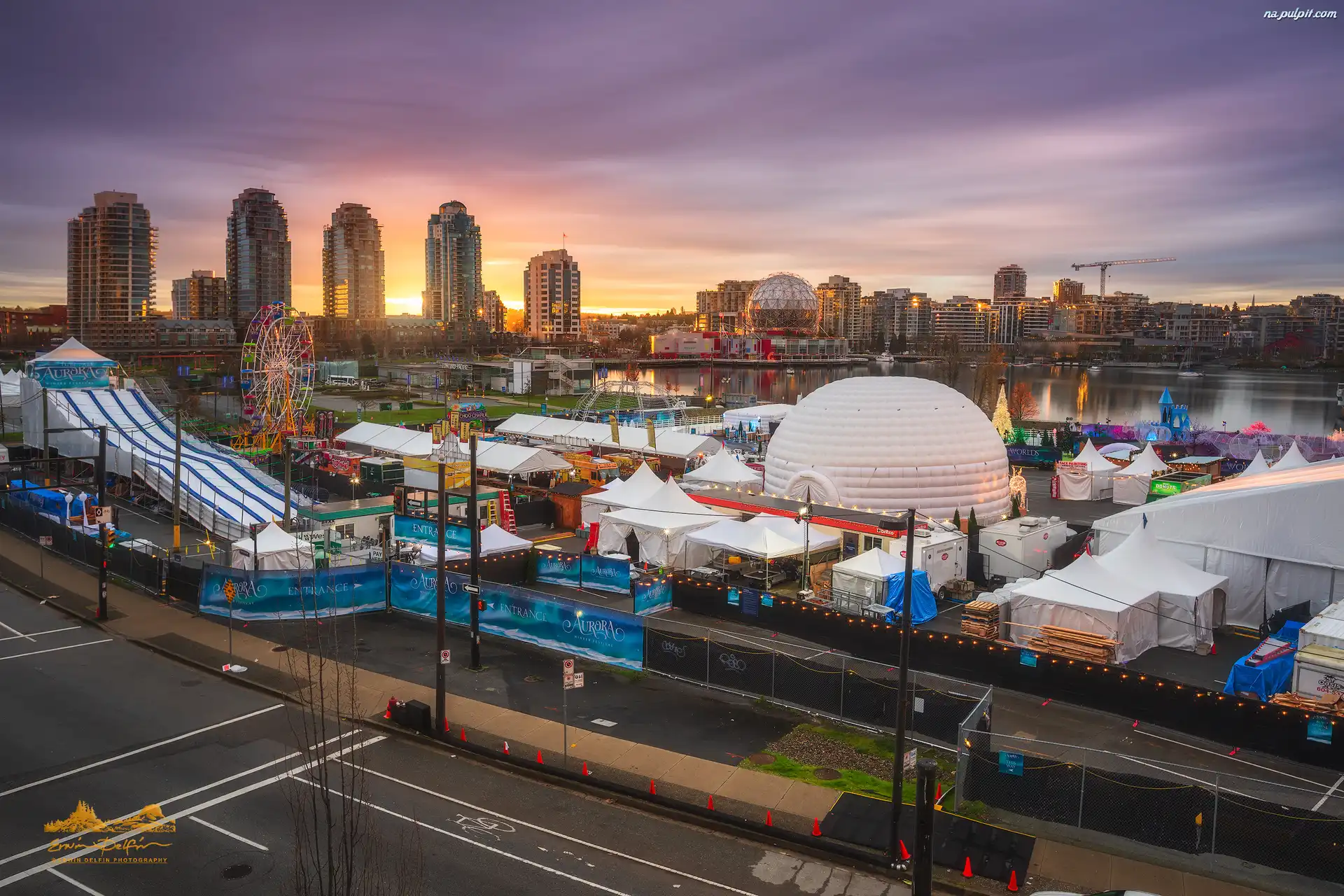 Karuzela, Vancouver, Wieżowce, Jarmark, Droga, Wschód słońca, Aurora Winter Festival, Kanada, Namioty Na Pulpit |