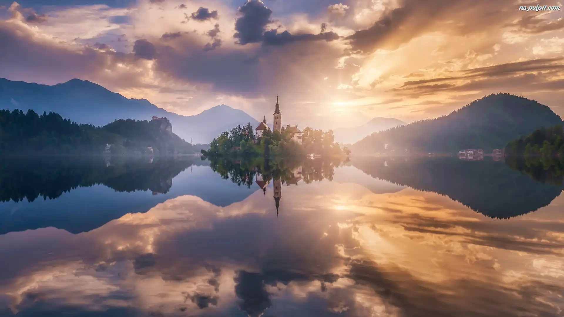 Wschód słońca, Jezioro Bled, Wyspa Blejski Otok, Chmury, Odbicie, Kościół Zwiastowania Marii Panny, Słowenia, Góry Alpy Julijskie Na Pulpit |