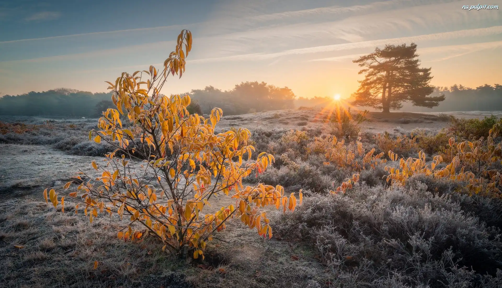 Wschód słońca, Szron, Drzewa, Krzewy, Mgła Na Pulpit