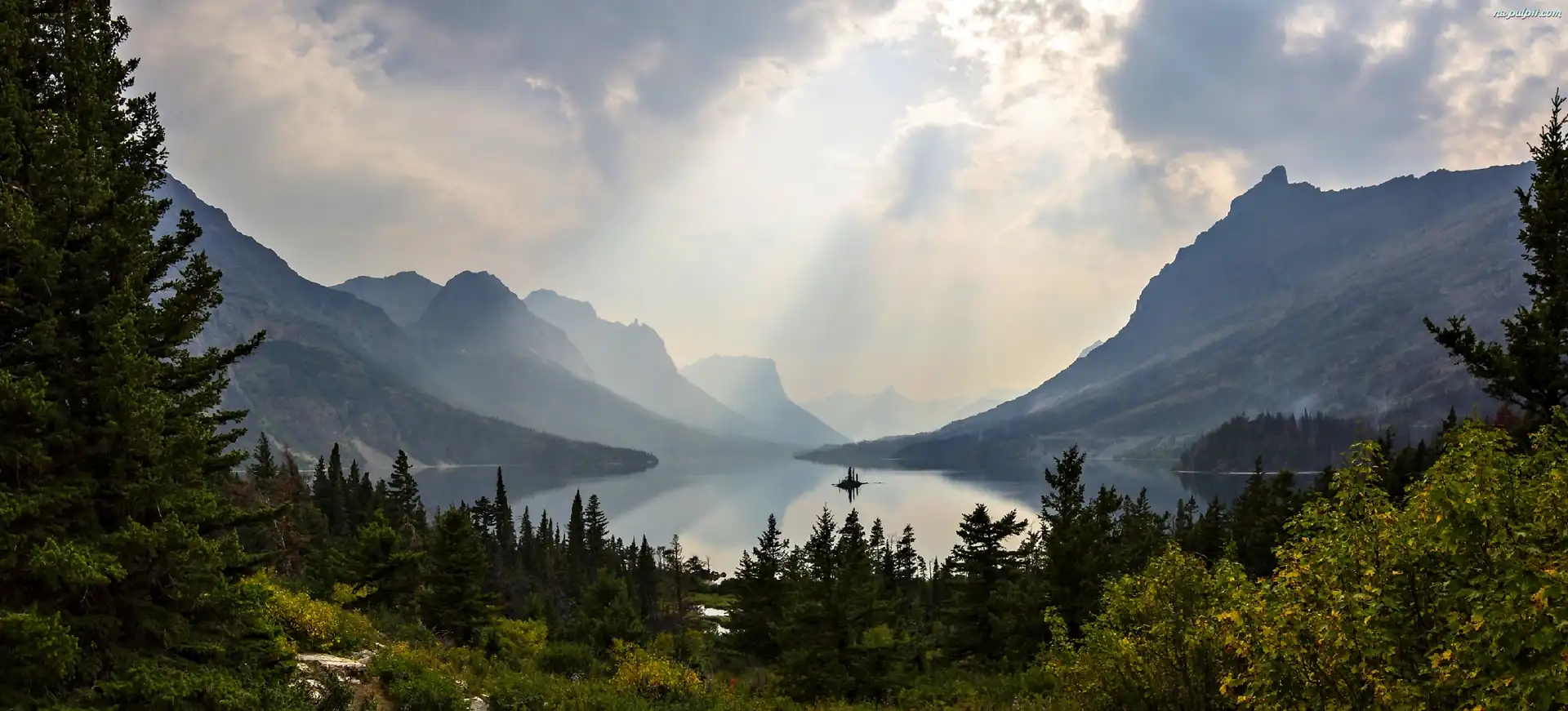 Lasy, Wschód Słońca, Panorama, Jezioro, Góry, Świt