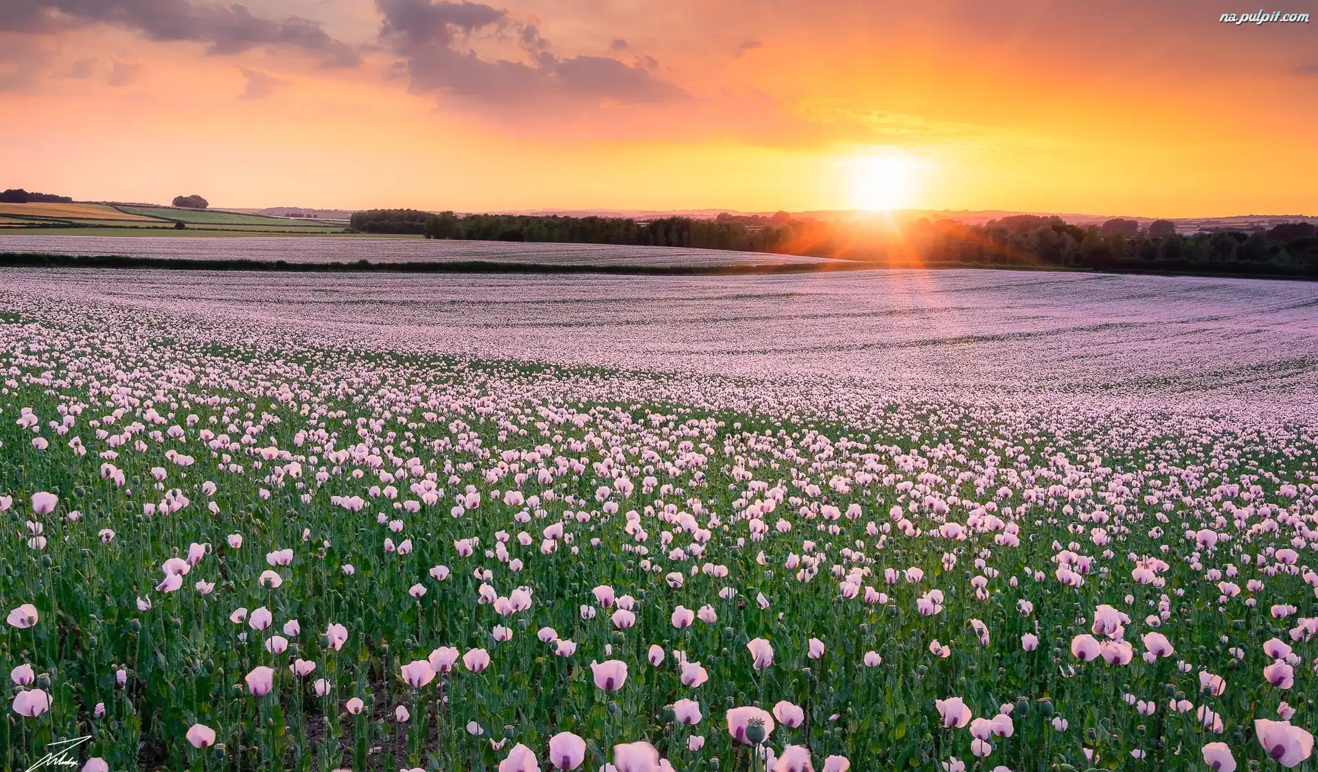 Drzewa, Pole, Kwiaty, Wschód słońca, Maki Na Pulpit