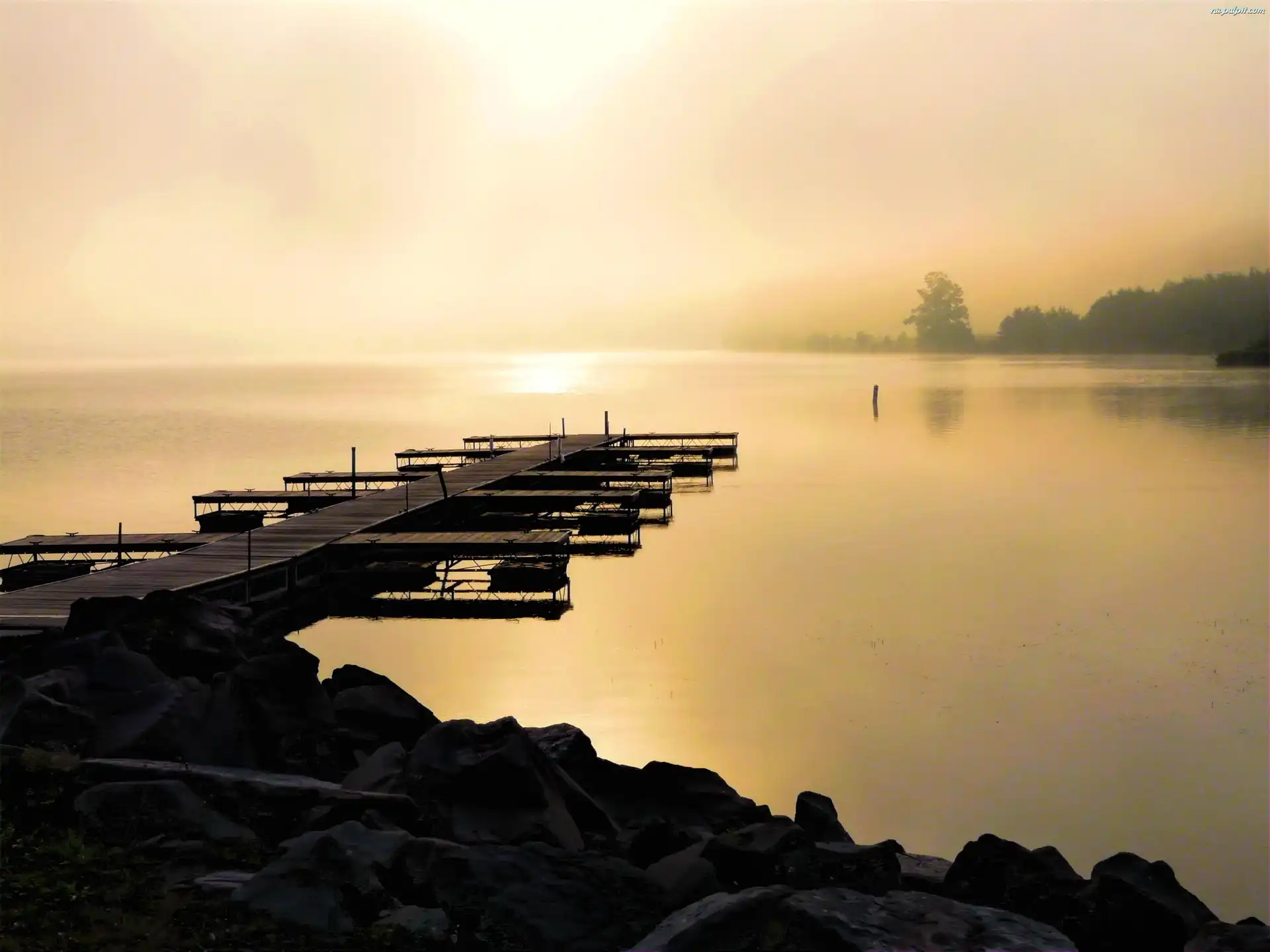 Wschód Słońca, Jezioro, Molo, Mgła Na Pulpit