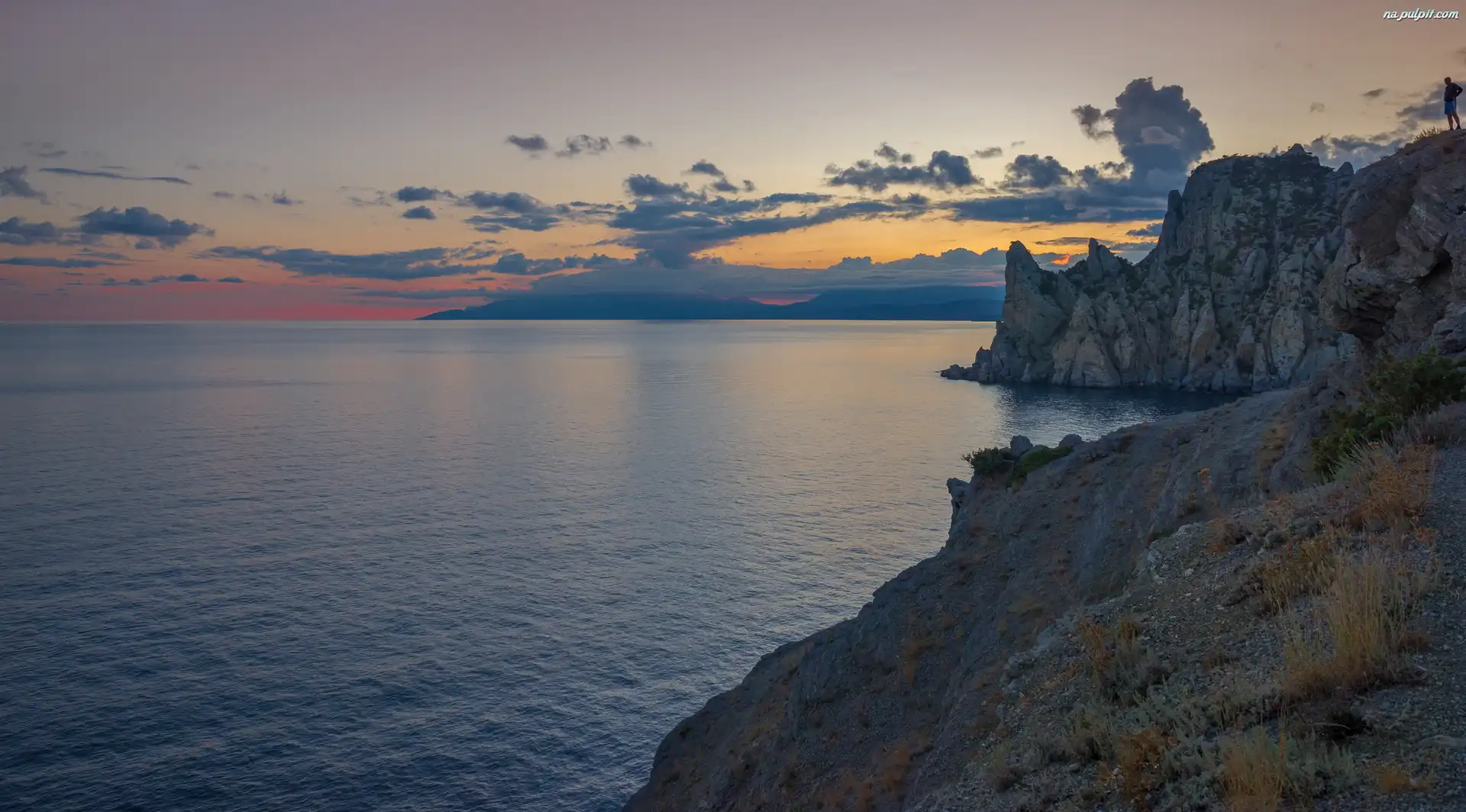 Wschód słońca, Niebo, Skały, Morze, Chmury Na Pulpit