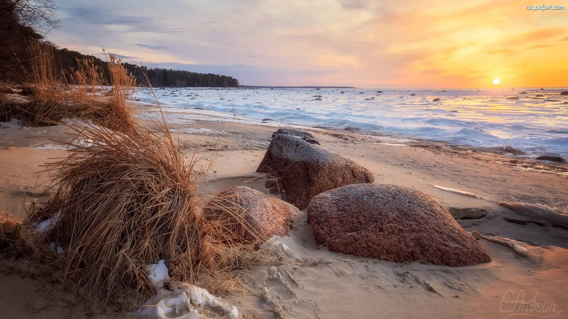 Wschód słońca, Trawa, Plaża, Morze, Kamienie Na Pulpit