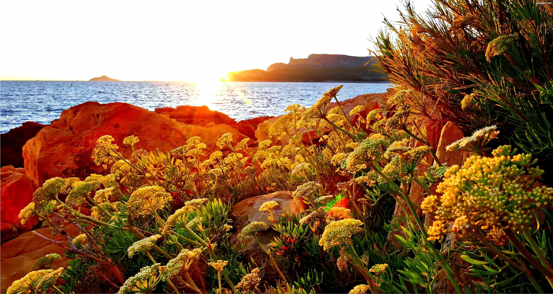 Wschód Słońca, Wybrzeże, Skały, Morze, Rośliny Na Pulpit