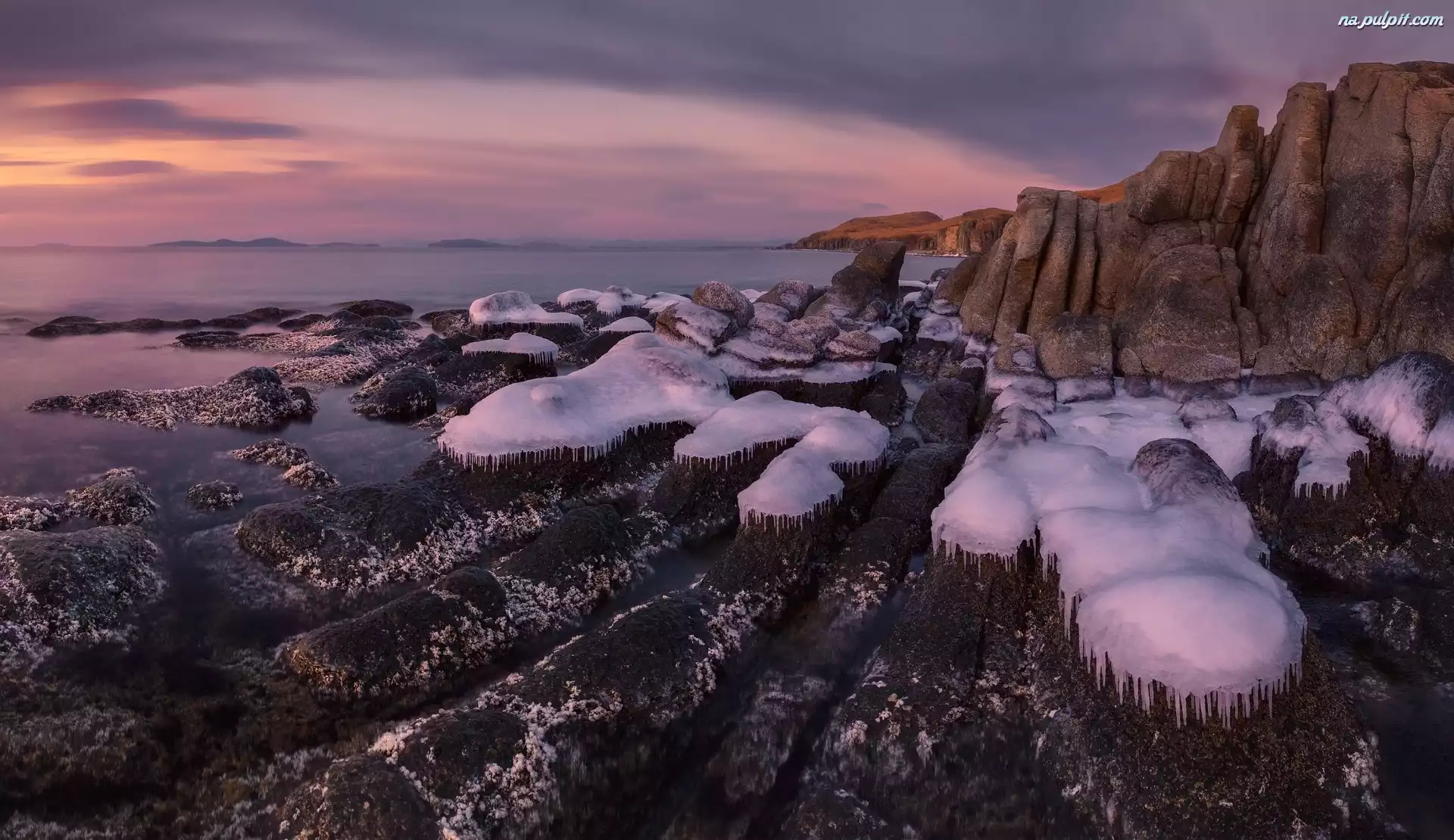Skały, Wschód Słońca, Rosja, Góry, Morze Japońskie, Śnieg Na Pulpit