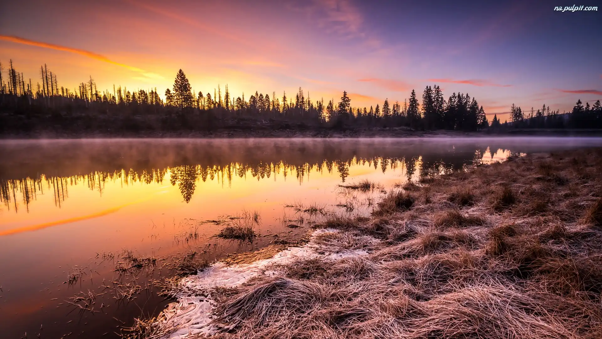 Wschód słońca, Drzewa, Trawa, Rzeka, Mgła Na Pulpit