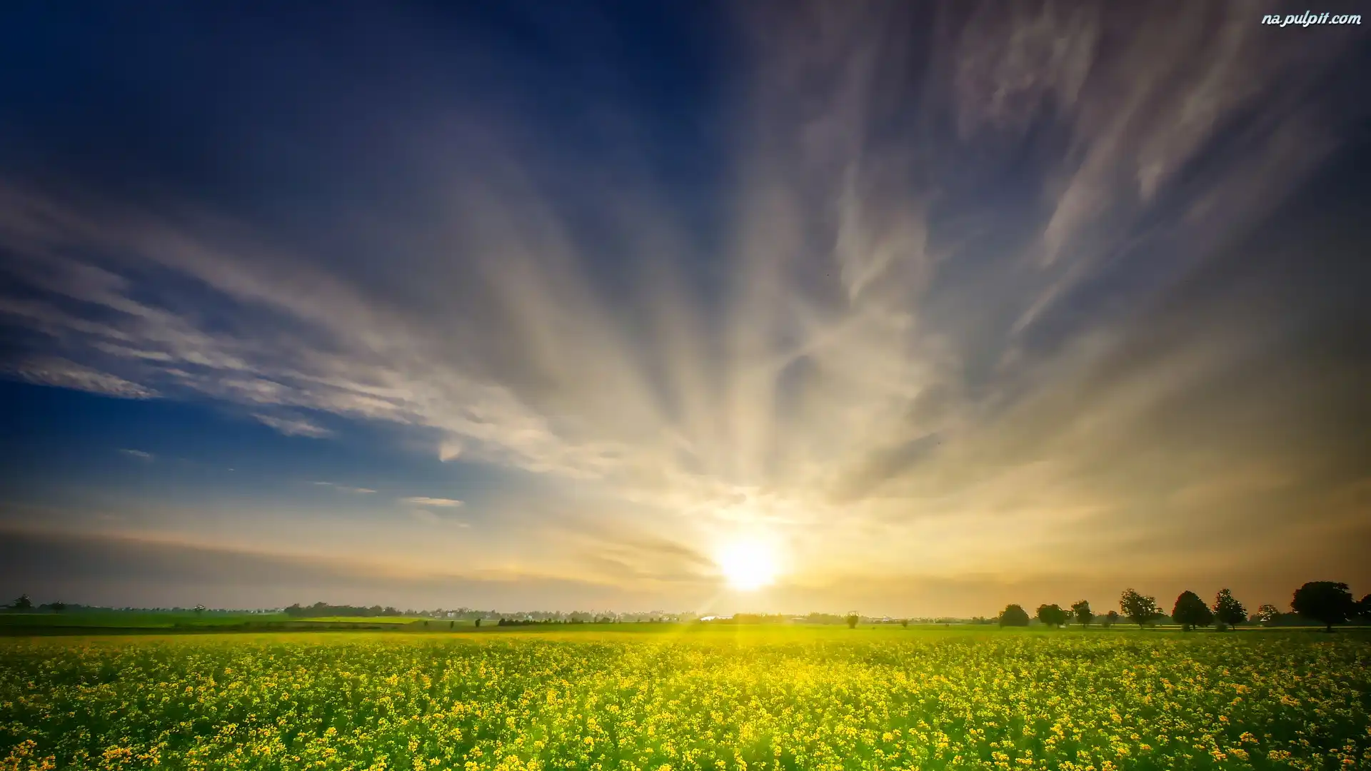 Wschód słońca, Pole, Rzepak, Drzewa Na Pulpit
