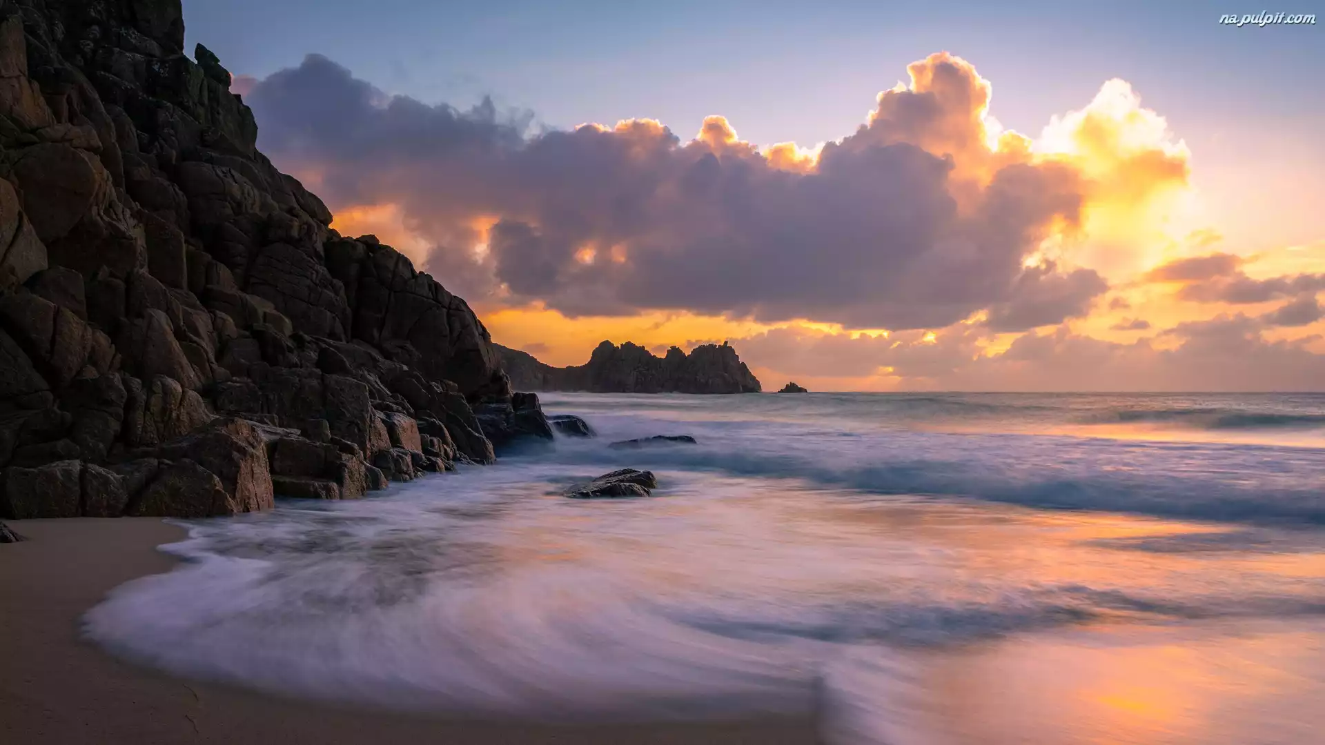 Chmury, Morze, Wybrzeże, Wschód słońca, Skały Na Pulpit