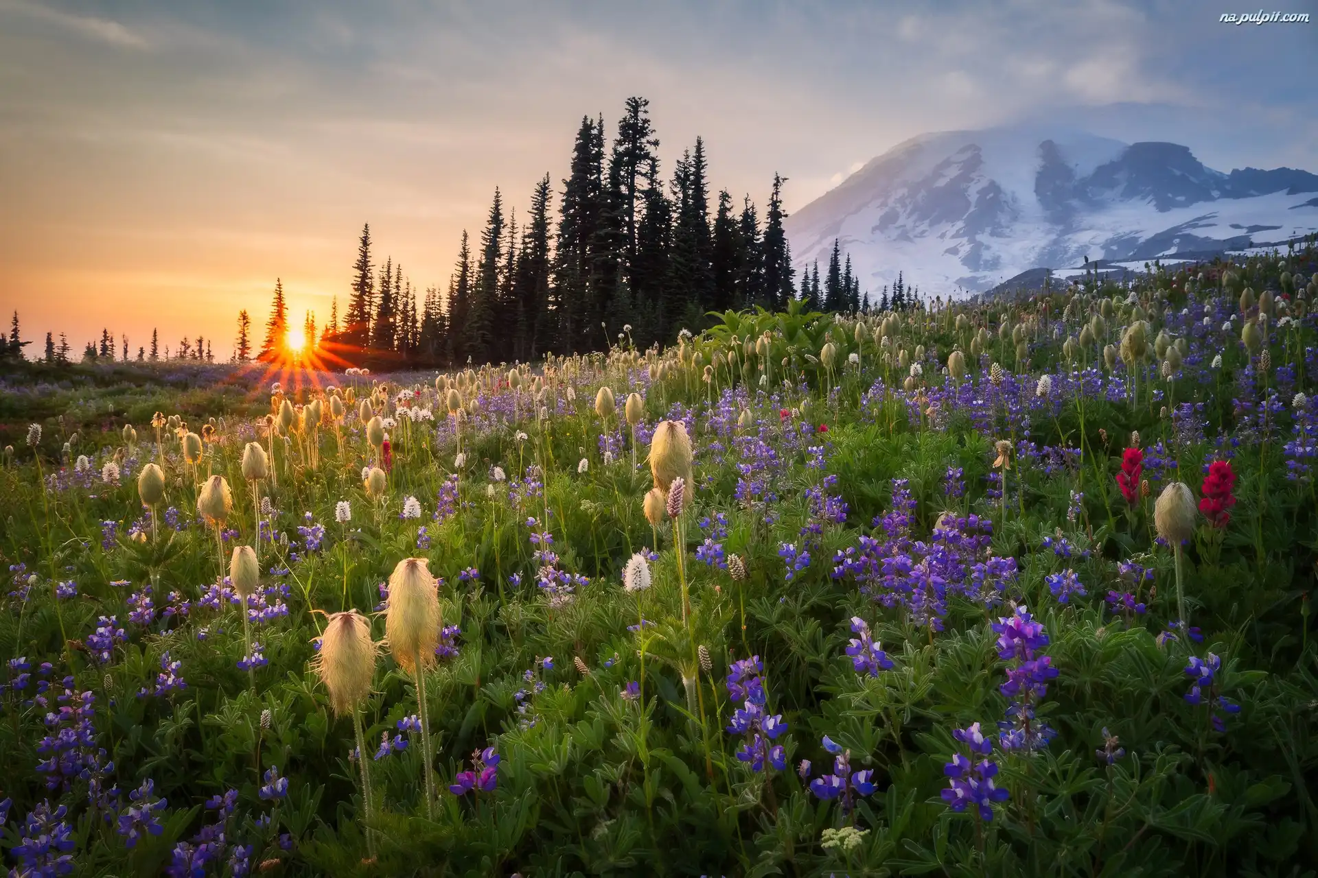 Wschód słońca, Zjednoczone, Park Narodowy Mount Rainier, Stratowulkan Mount Rainier, Drzewa, Góry, Łąka, Stany, Kwiaty Na Pulpit |