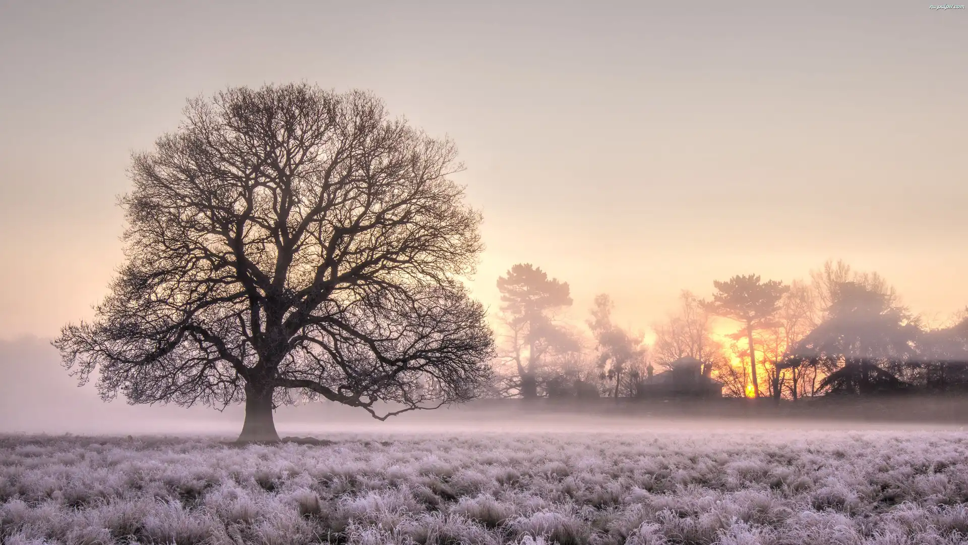 Mgła, Drzewo, Oszroniona, Wschód słońca, Trawa Na Pulpit