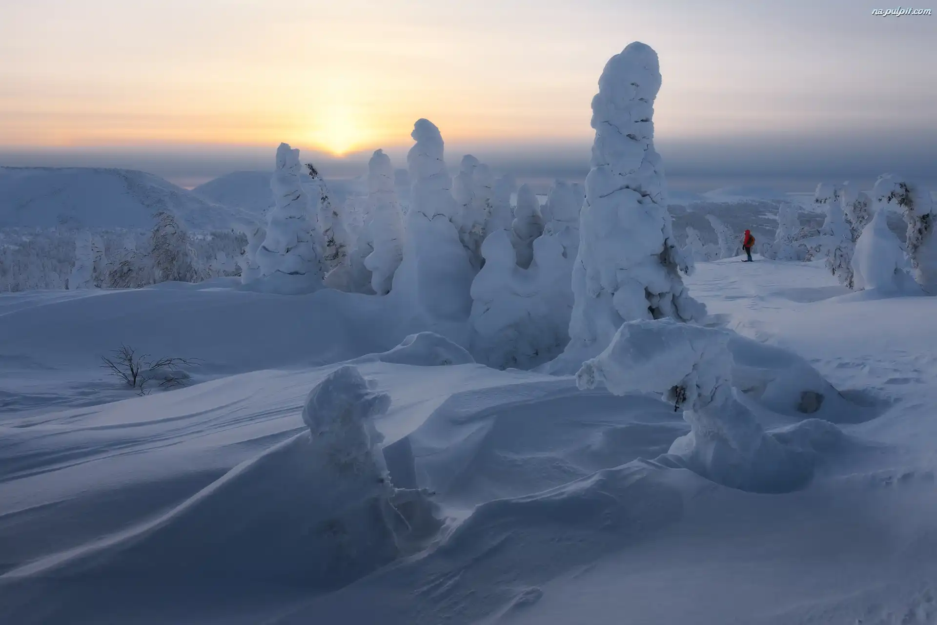 Wschód słońca, Drzewa, Wzgórza, Zima Na Pulpit