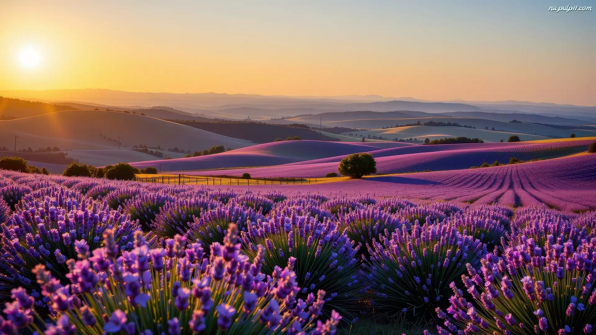 Drzewa, Lawenda, Wzgórza, Wschód słońca, Pole, AI Na Pulpit