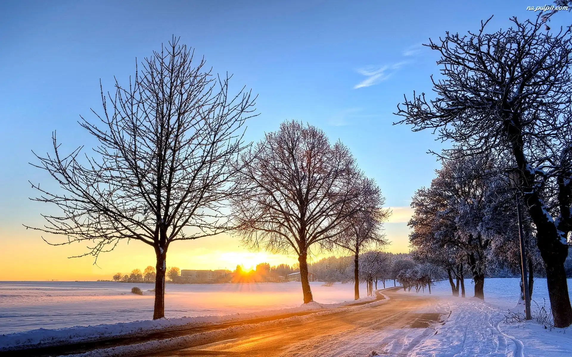 Wschód, Droga, Drzewa, Słońca, Zima, Pola
