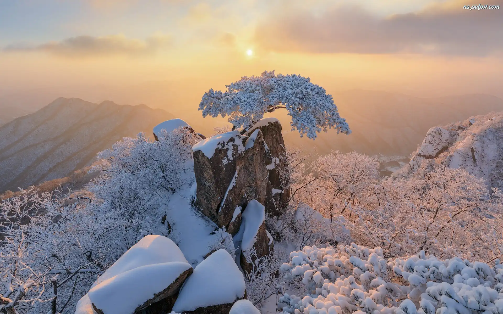 Wschód słońca, Drzewa, Skały, Góry, Park Prowincjonalny Daedunsan, Prowincja Jeolla Północna, Korea Południowa, Ośnieżone, Zima, Sosna Na Pulpit |