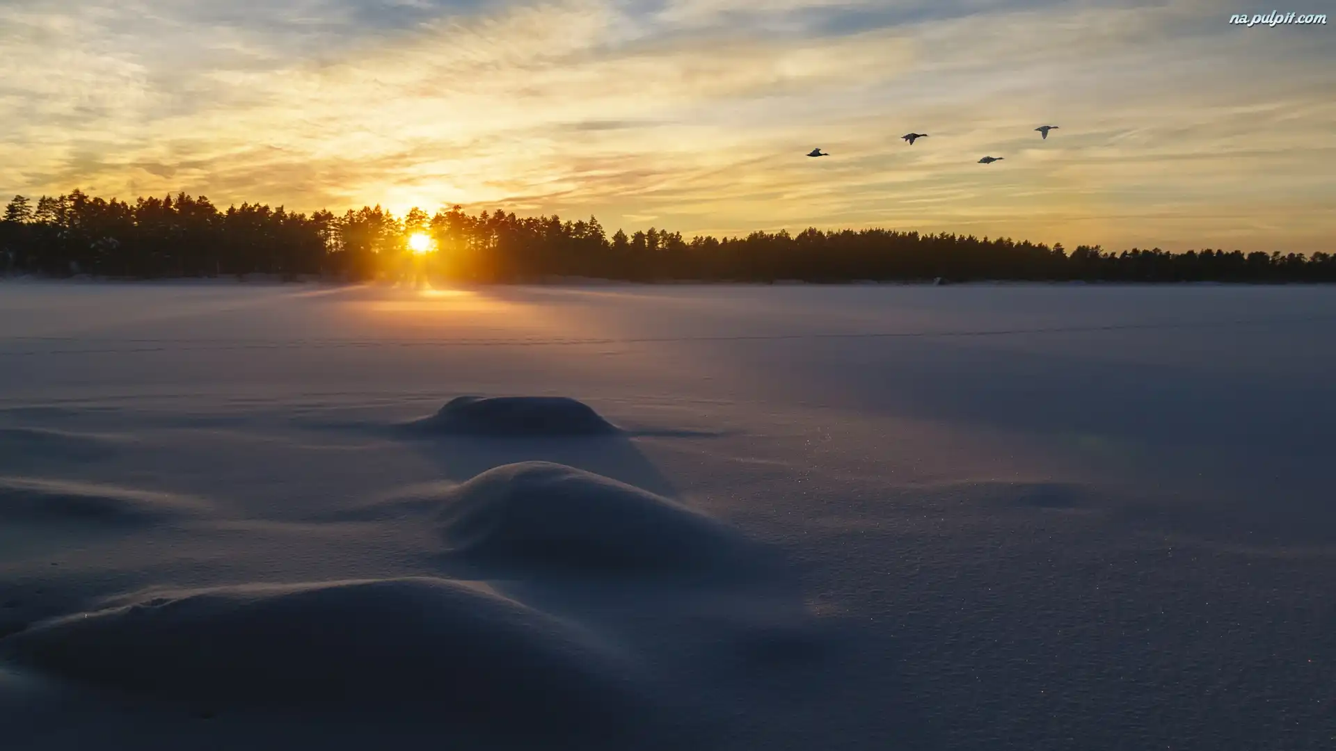 Wschód słońca, Pole, Las, Zima, Ptaki Na Pulpit