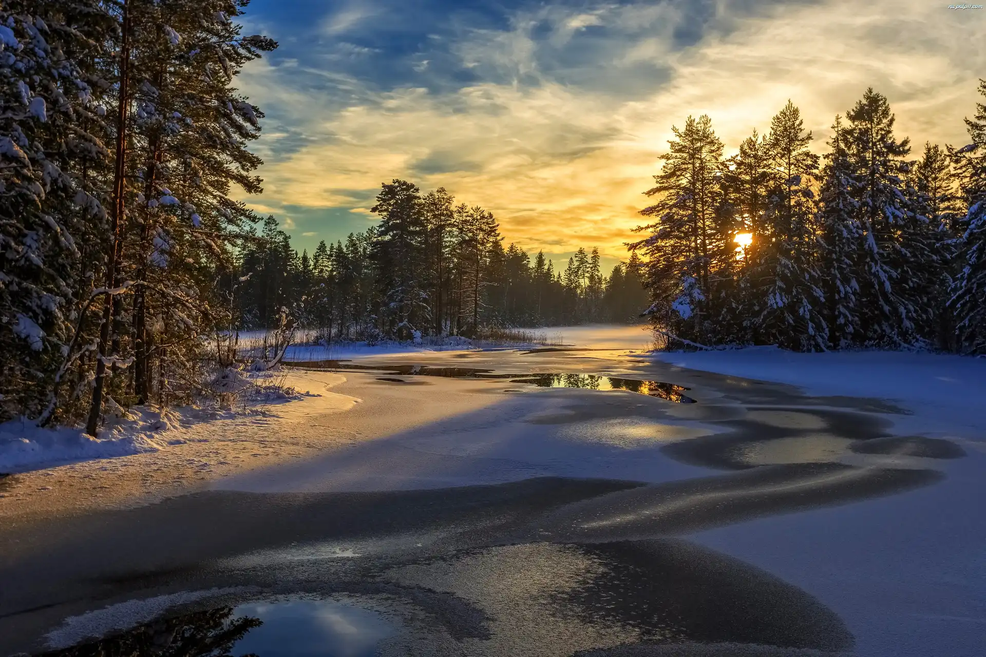 Wschód słońca, Rzeka, Zima, Las Na Pulpit
