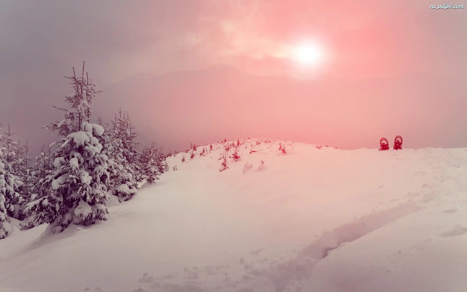 Wschód słońca, Świerki, Wzgórze, Zima, Mgła