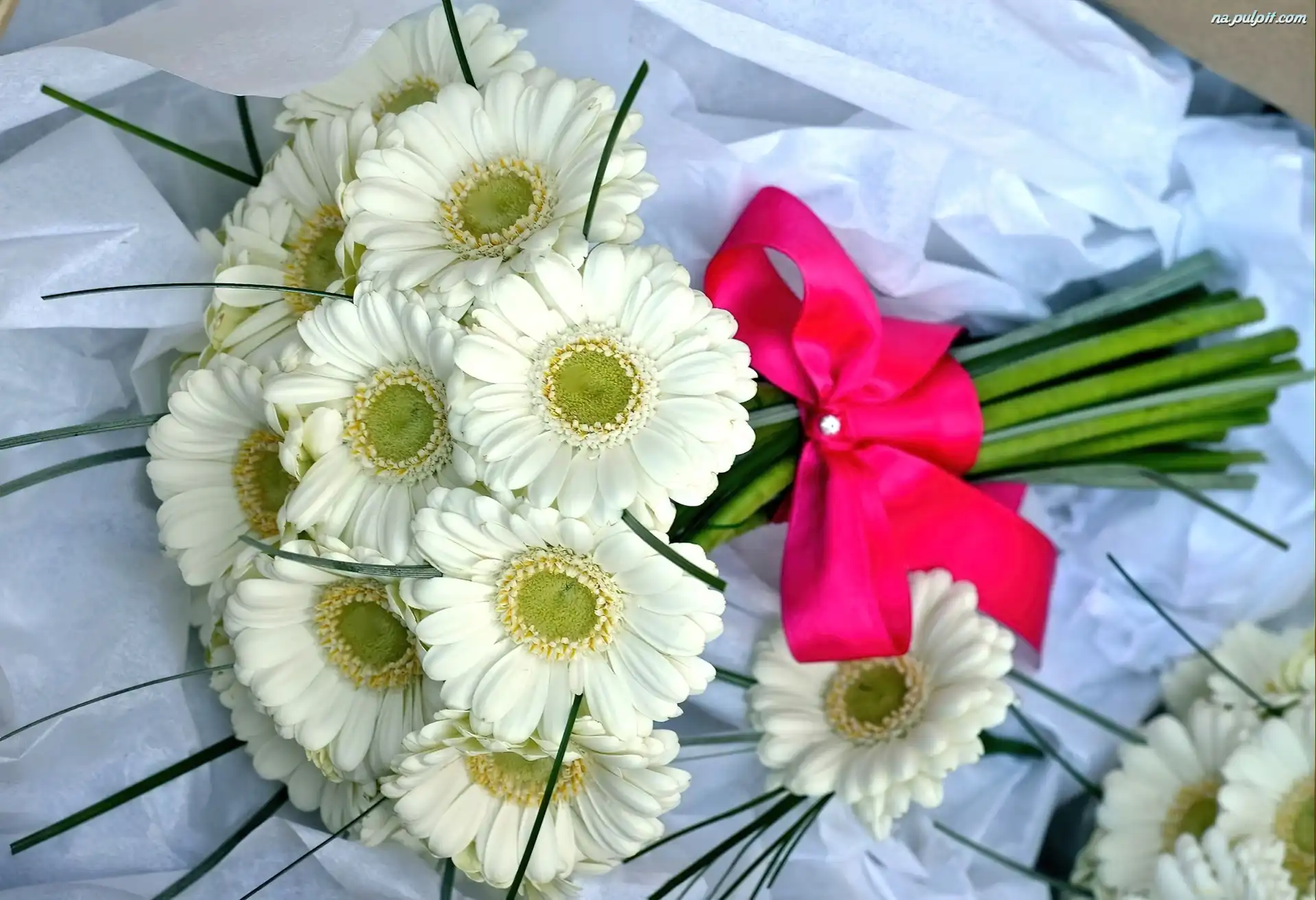 Wstążka, Gerberów, Białych, Bukiet, Czerwona Na Pulpit