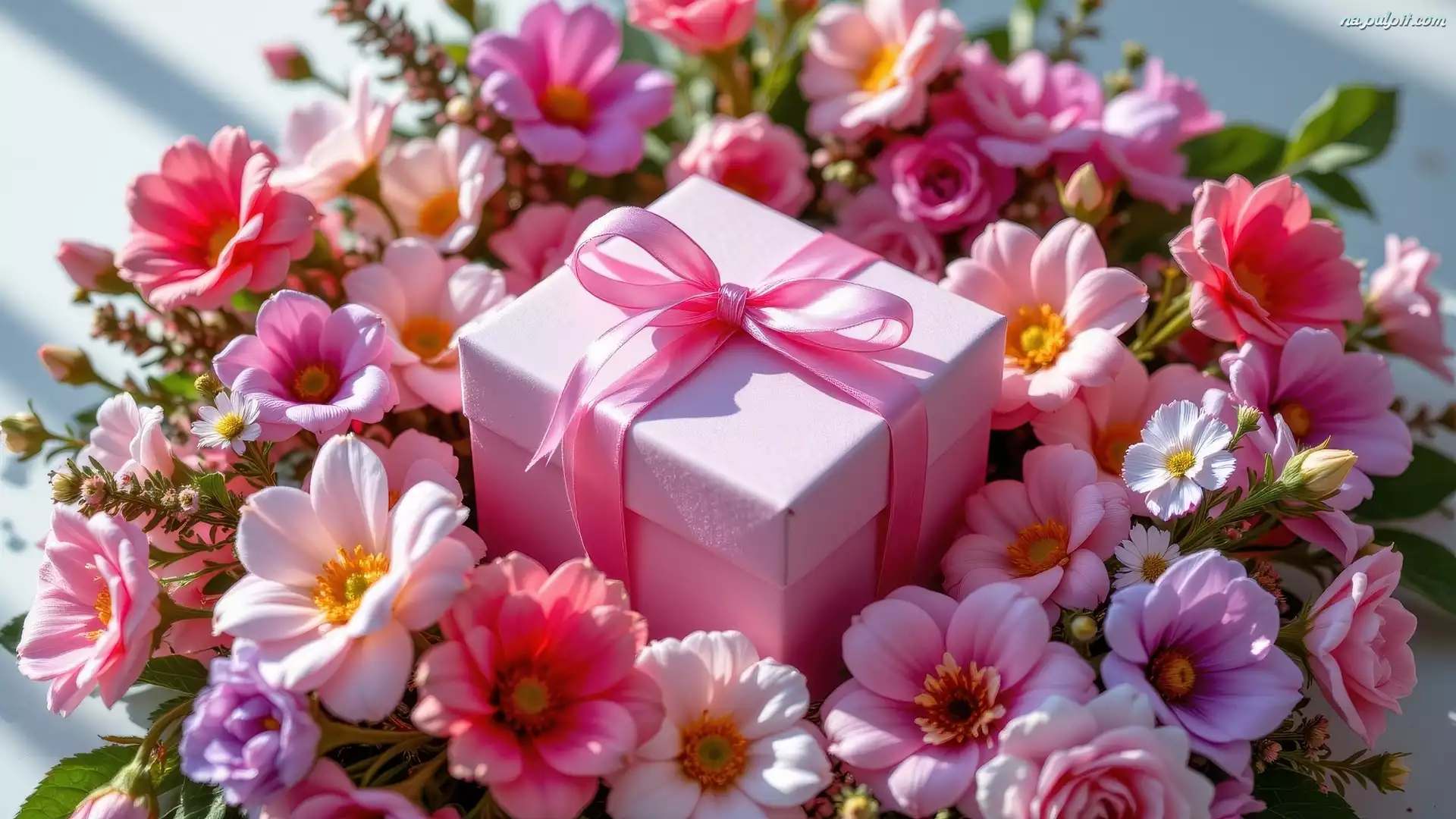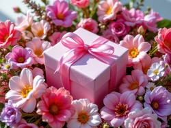 Kolorowe, Pudełko, Różowa, Wstążka, Prezent, Kwiaty