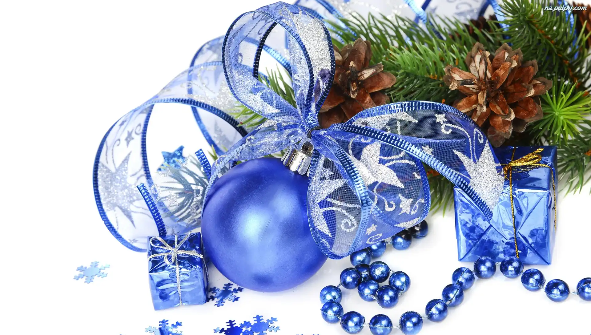 Świąteczna, Szyszki, Wstążka, Boże Narodzenie, Gałązki, Prezenty, Niebieska, Koraliki, Niebieska, Kompozycja, Bombka Na Pulpit |