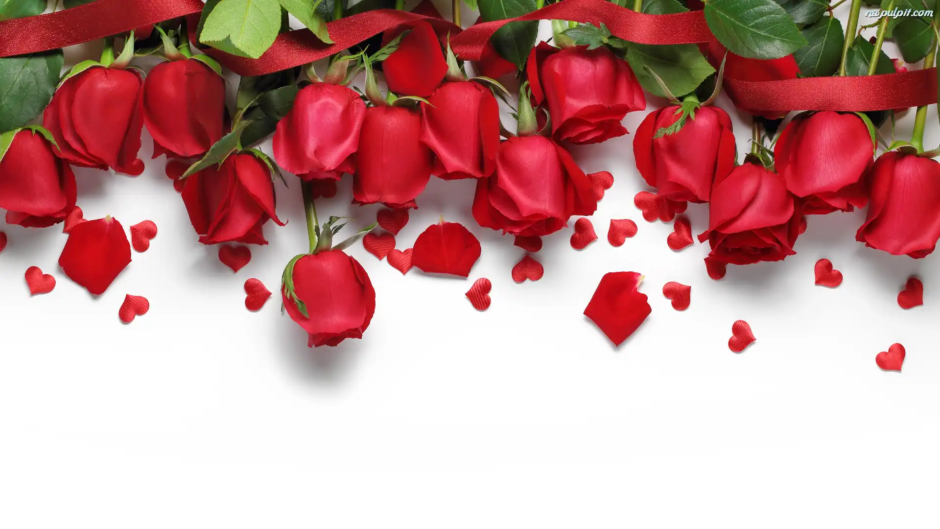 Płatki, Róże, Serduszka, Wstążka, Czerwone, Białe Tło Na Pulpit