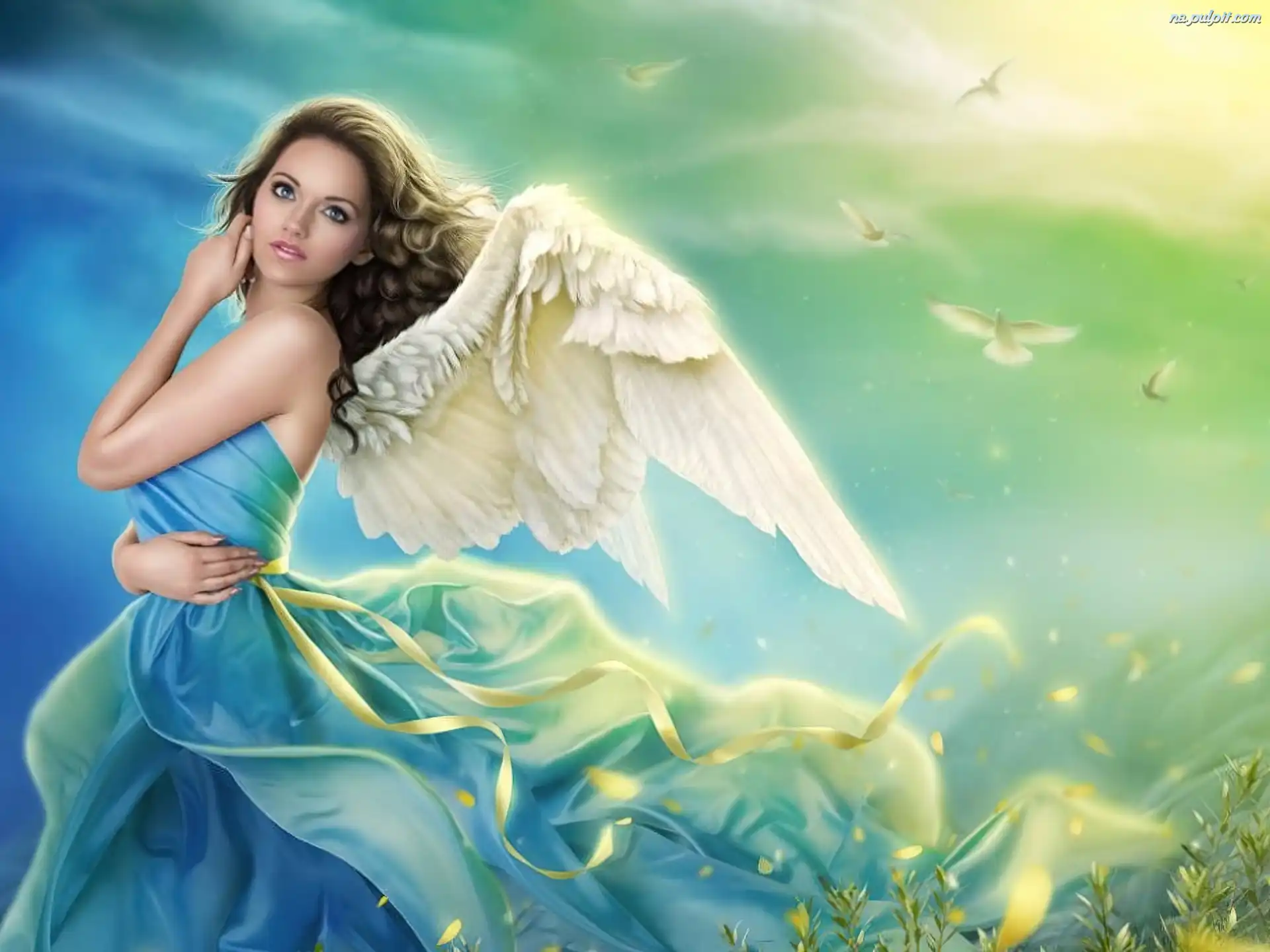 Wstążki, Anioł, Kobieta, Ptaki