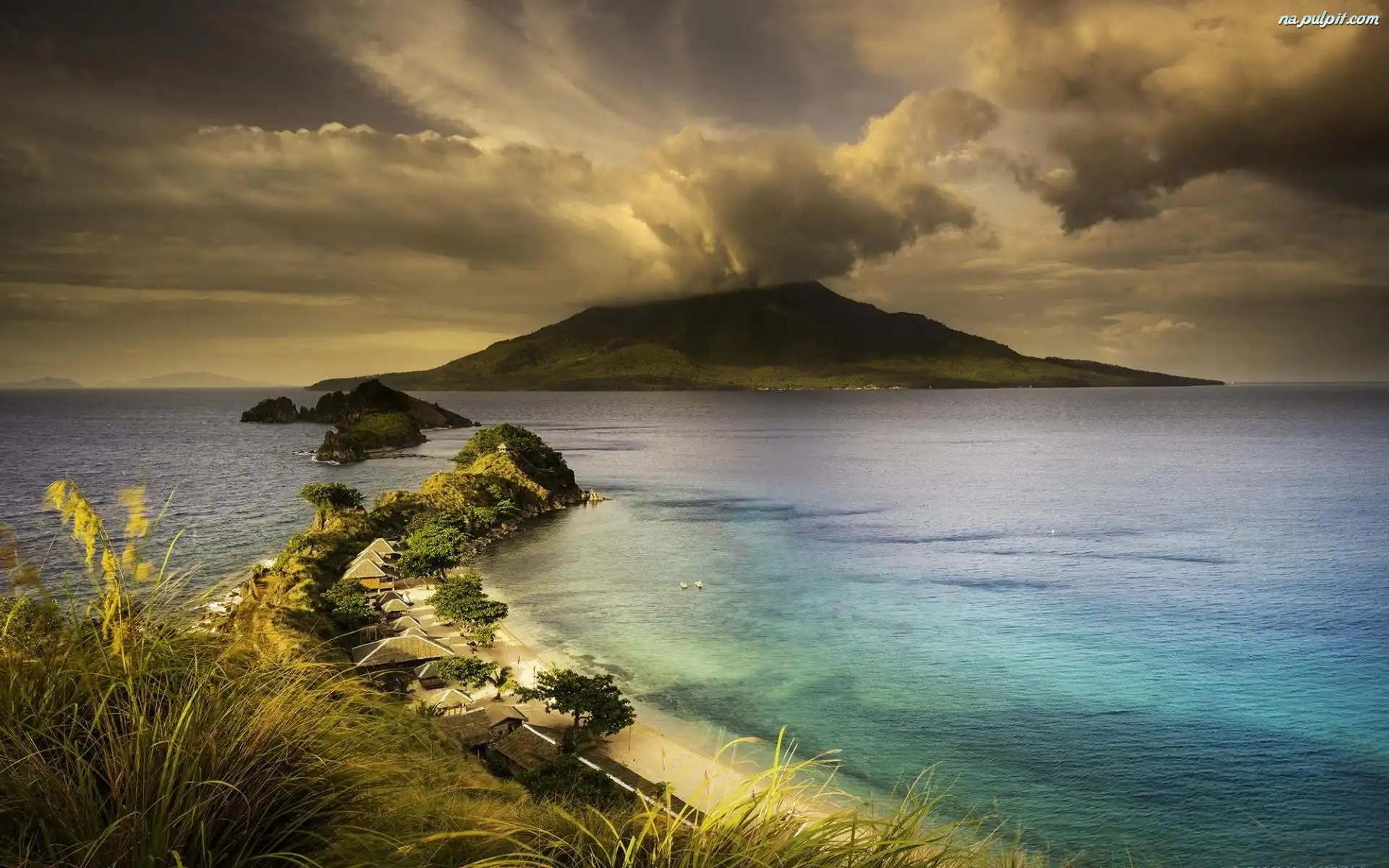 Wulkan, Plaża, Morze, Cypel, Wyspy, Domki