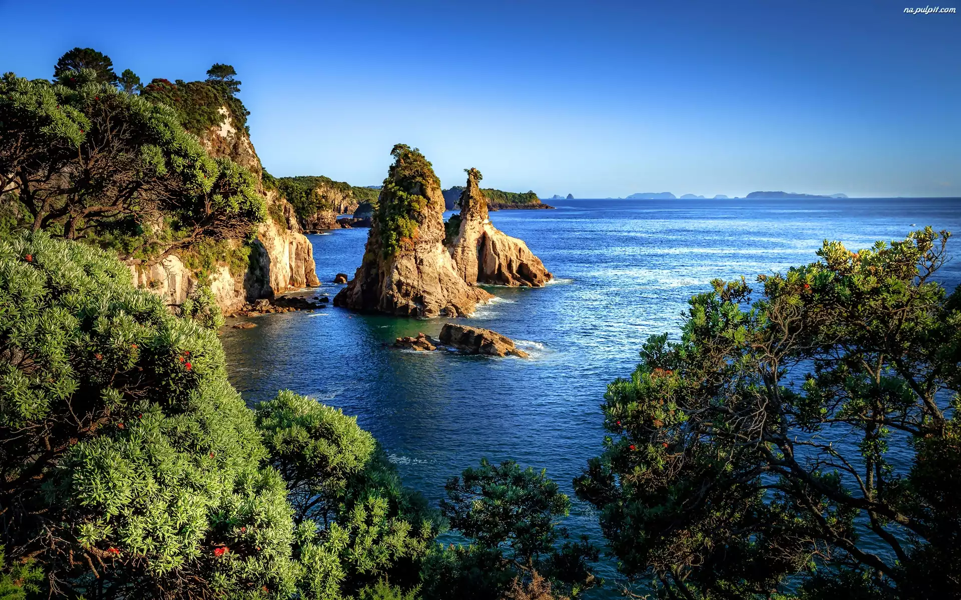 Hahei, Wybrzeże, Krzewy, Morze, Nowa Zelandia, Skały Na Pulpit