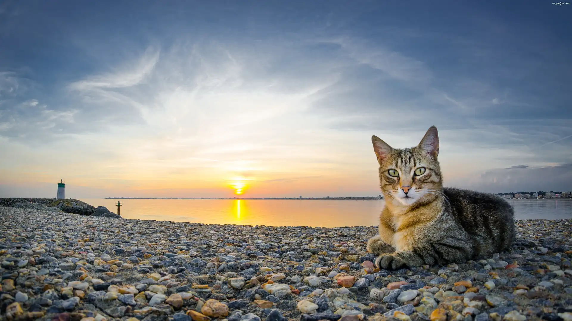 Wybrzeże, Wschód, Słońca, Latarnia, Kot, Morska