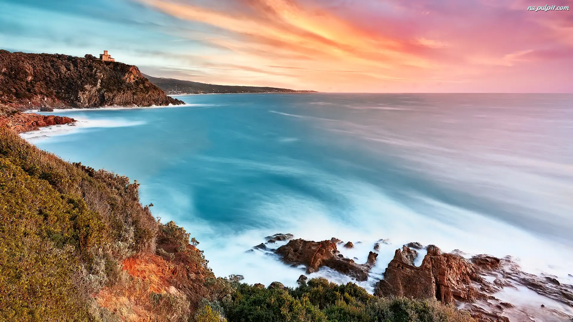 Wschód słońca, Zamek Castello Sonnino, Wybrzeże, Livorno, Włochy, Morze Liguryjskie, Skała, Skały Na Pulpit |