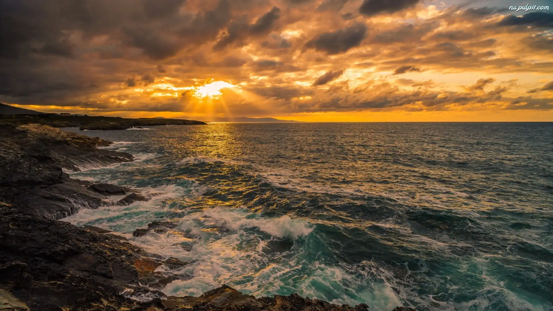 Wybrzeże, Chmury, Skały, Morze, Zachód Słońca Na Pulpit