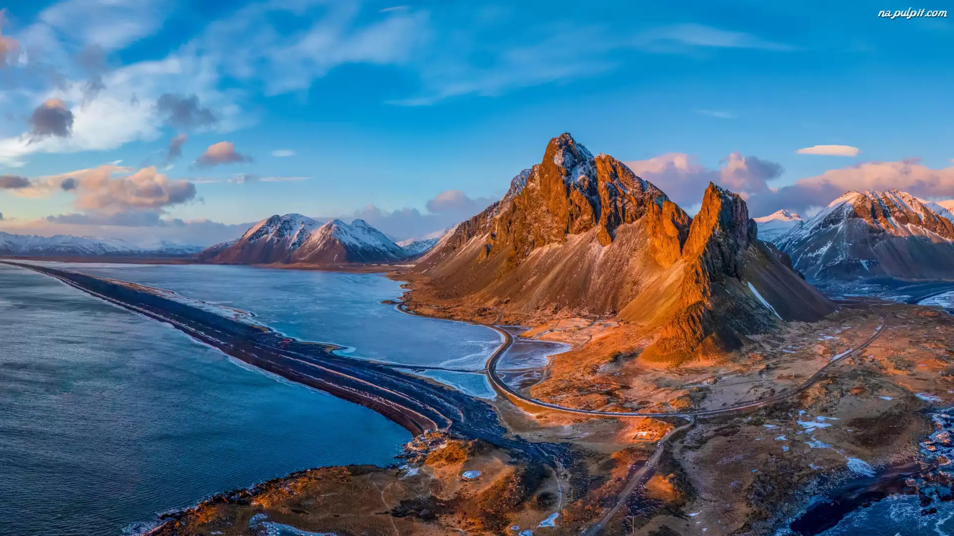Morze, Eystrahorn, Zatoka, Islandia, Chmury, Niebo, Góra, Wybrzeże Na Pulpit