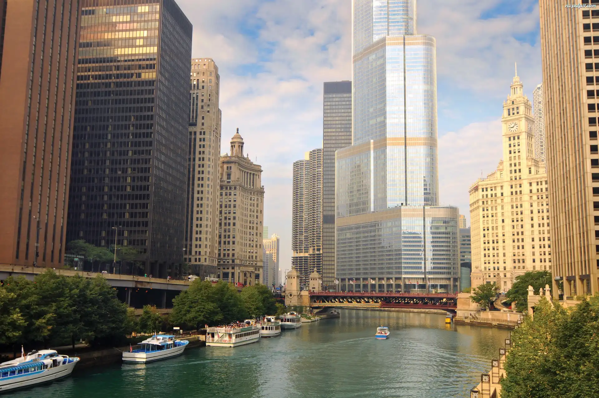 Wycieczkowe, Rzeka, Wieżowce, Miasto, Statki