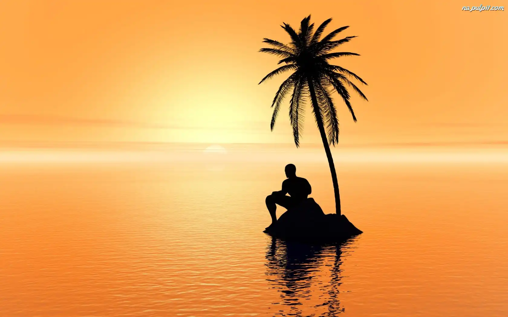Wysepka, Zachód, Słońca, Mężczyzna, Morze, Palma Na Pulpit