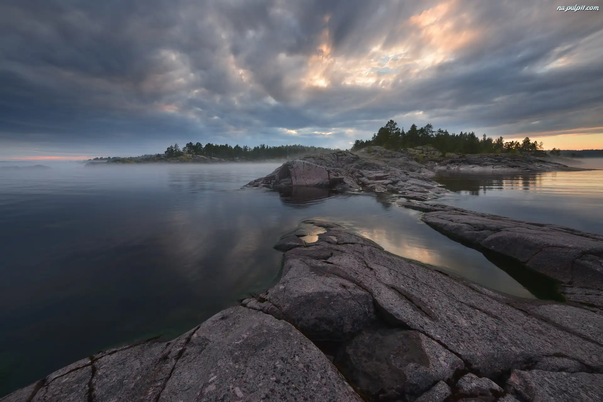 Rosja, Wysepki, Karelia, Drzewa, Skały, Jezioro Ładoga, Chmury Na Pulpit