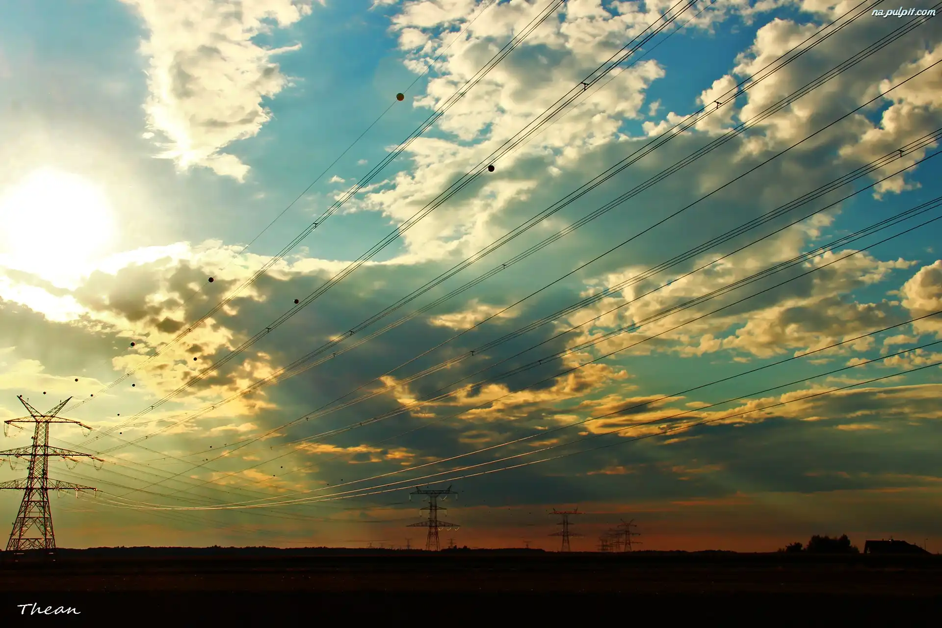 Wysokiego, Chmury, Promienie, Napięcia, Linie, Niebo Na Pulpit