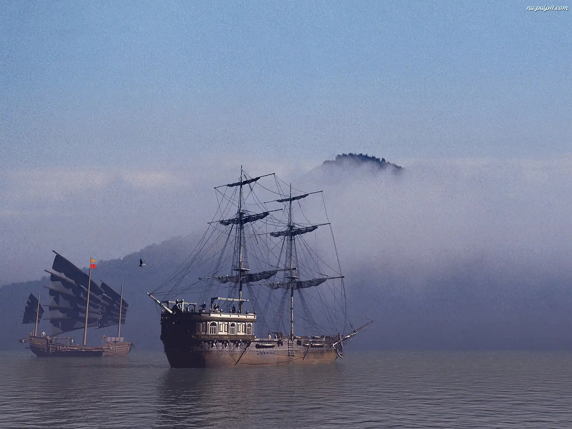 Wyspa, Morze, Żaglowiec, Mgła Na Pulpit
