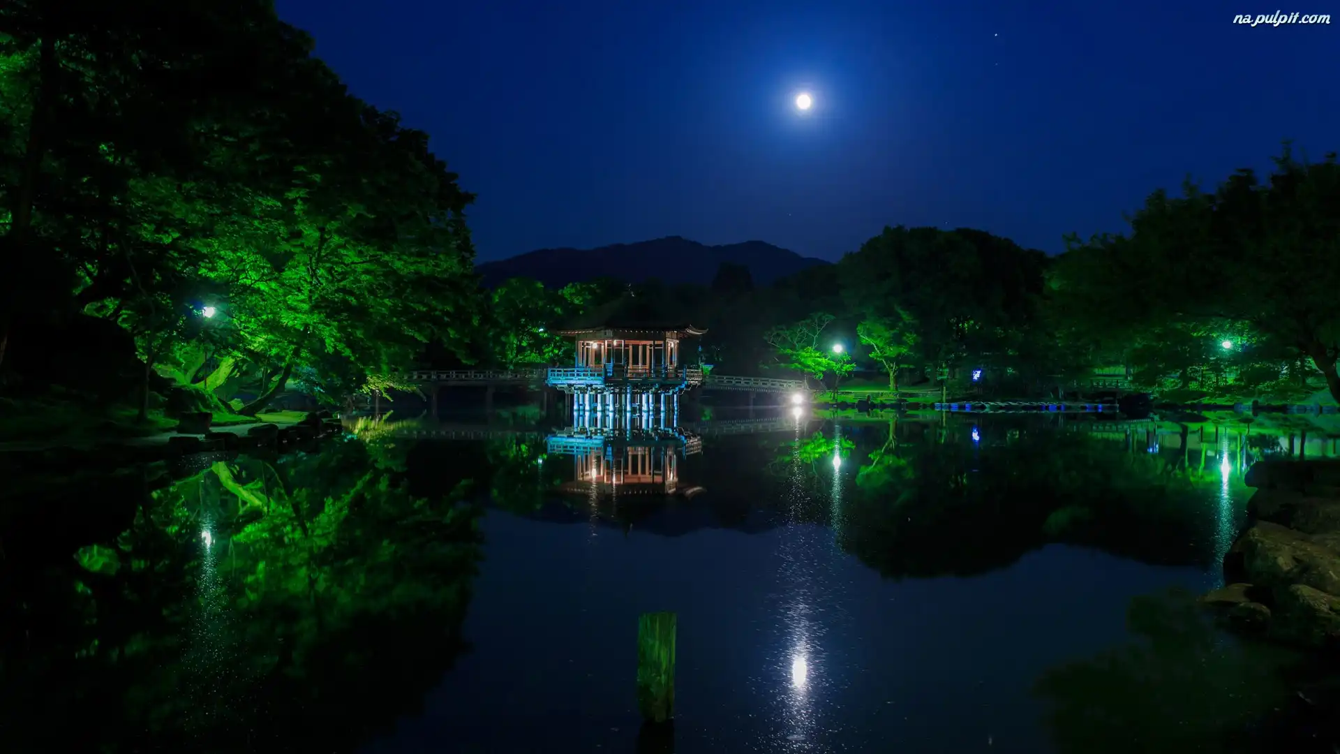 Wyspa Honsiu, Staw, Nara Park, Miasto Nara, Noc, Drzewa, Odbicie, Altana Ukimido Pavilion, Japonia, Księżyc Na Pulpit |