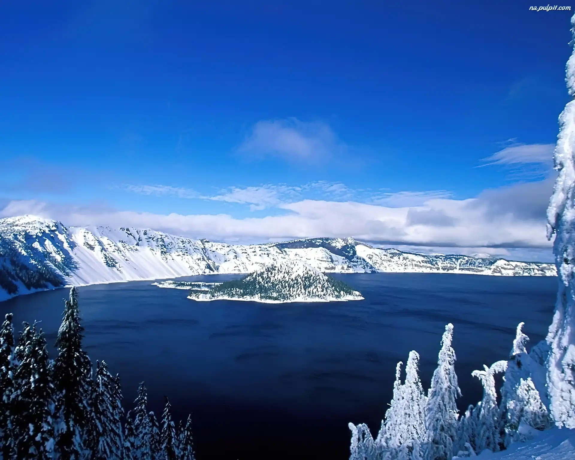 Wyspa, Góry, Las, Jezioro, Śnieg Na Pulpit
