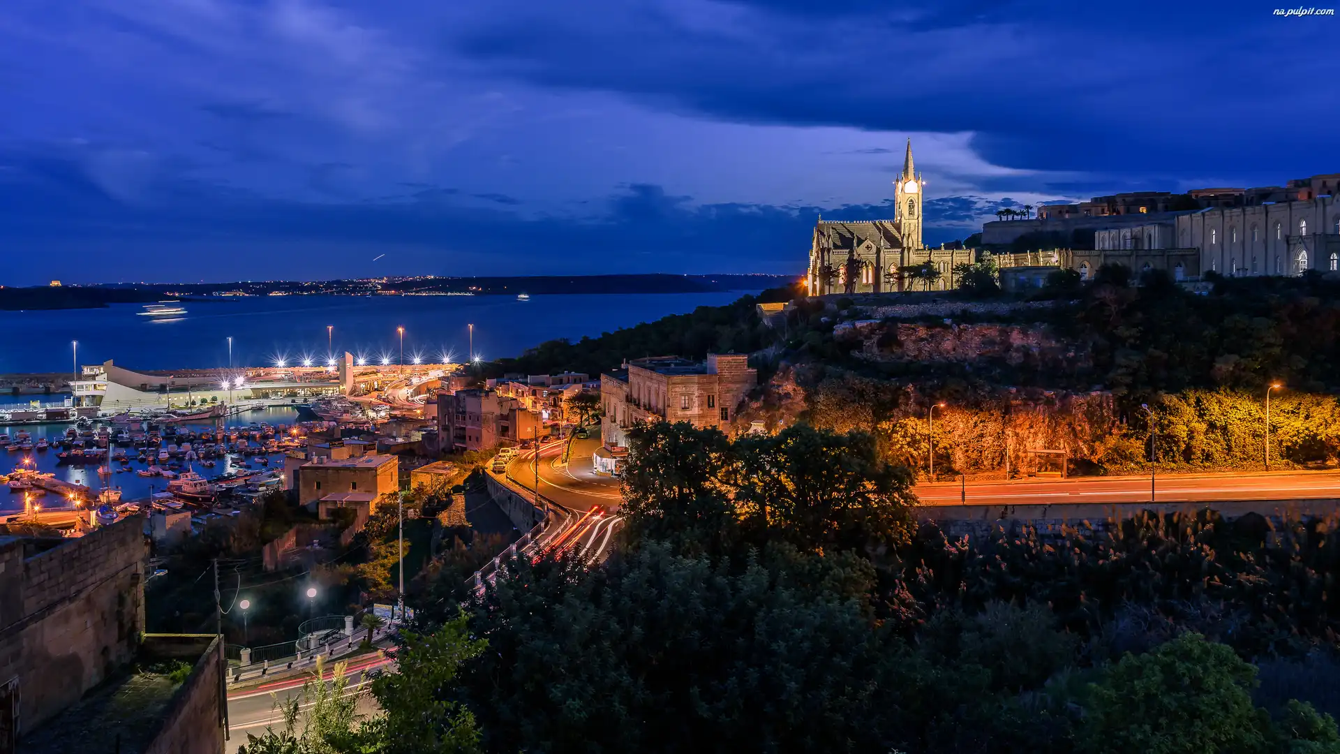 Mgarr, Noc, Zatoka, Oświetlone, Wyspa Gozo, Malta, Ulice, Miasto, Kościół Our lady of Lourdes Na Pulpit |