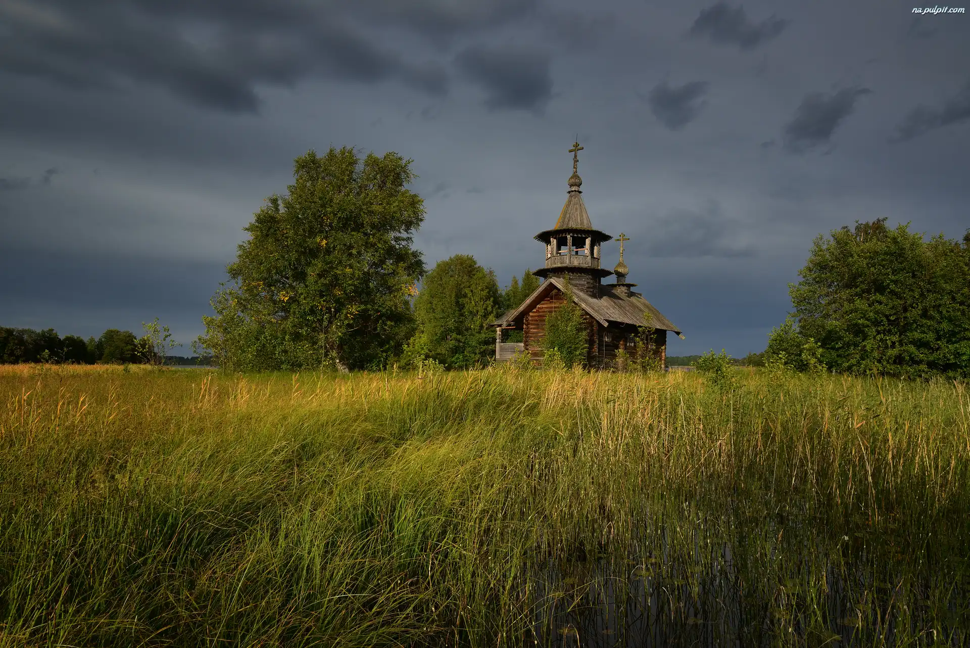Wyspa Kiży, Kaplica Piotra i Pawła, Trawa, Karelia, Rosja, Drzewa, Cerkiew, Wieś Eglowo Na Pulpit