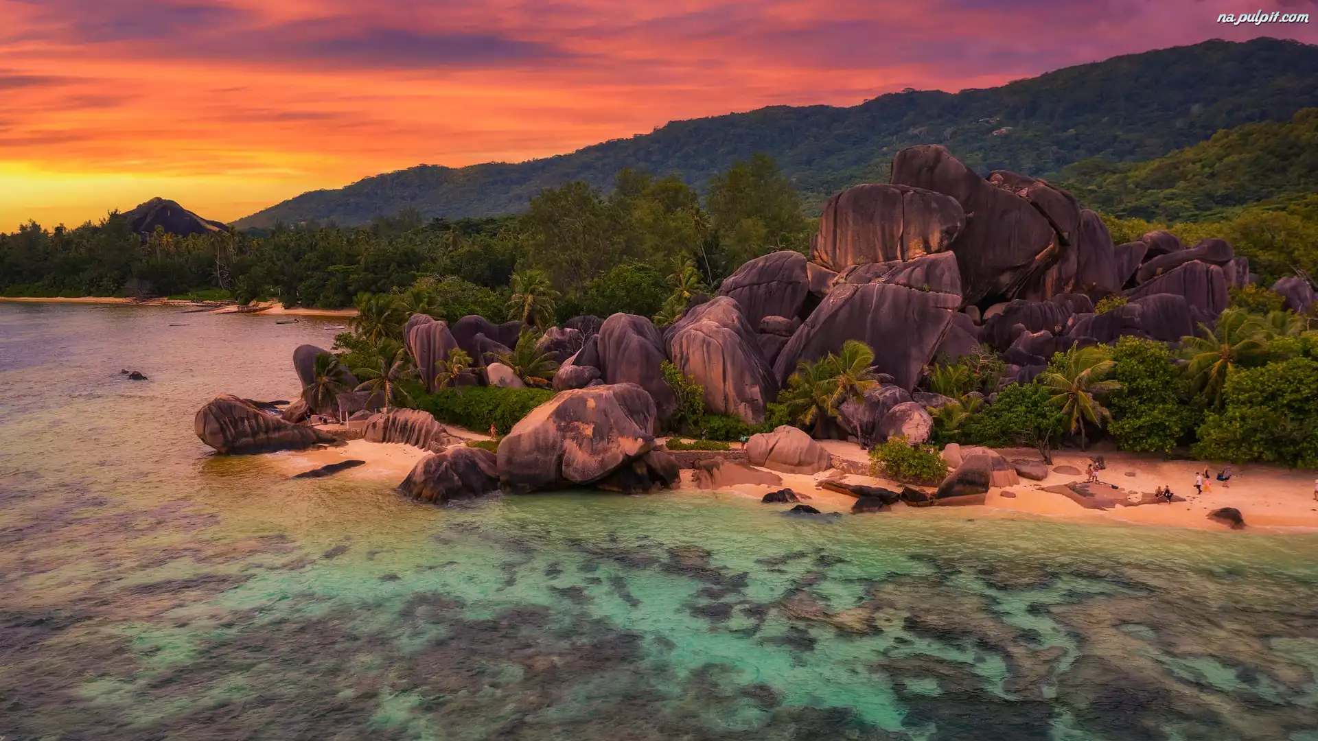 Palmy, Zachód słońca, Wyspa, Morze, Plaża, La Digue, Seszele, Skały, Anse Source dArgent Na Pulpit |