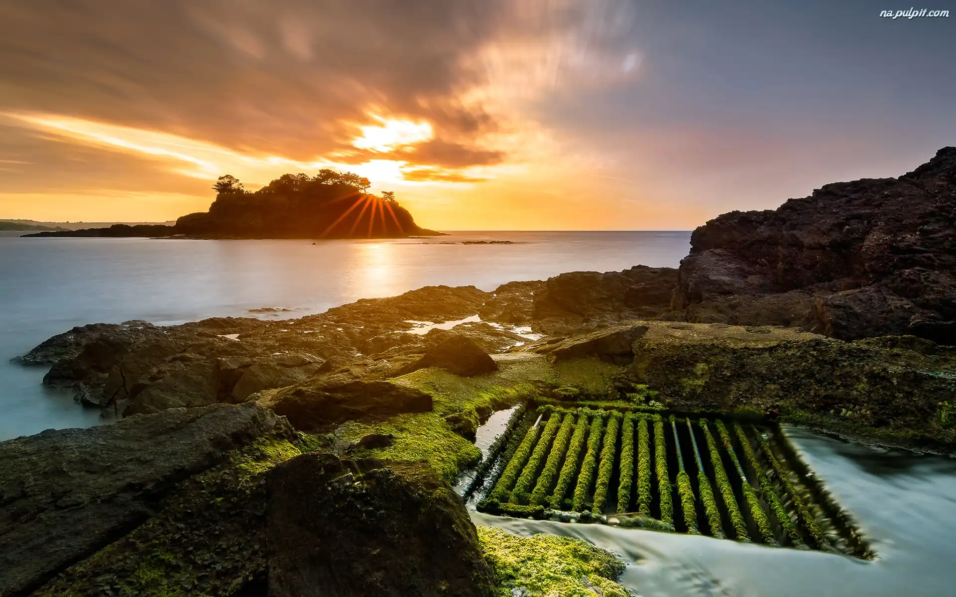 Wyspa, Mech, Skały, Morze, Zachód słońca Na Pulpit