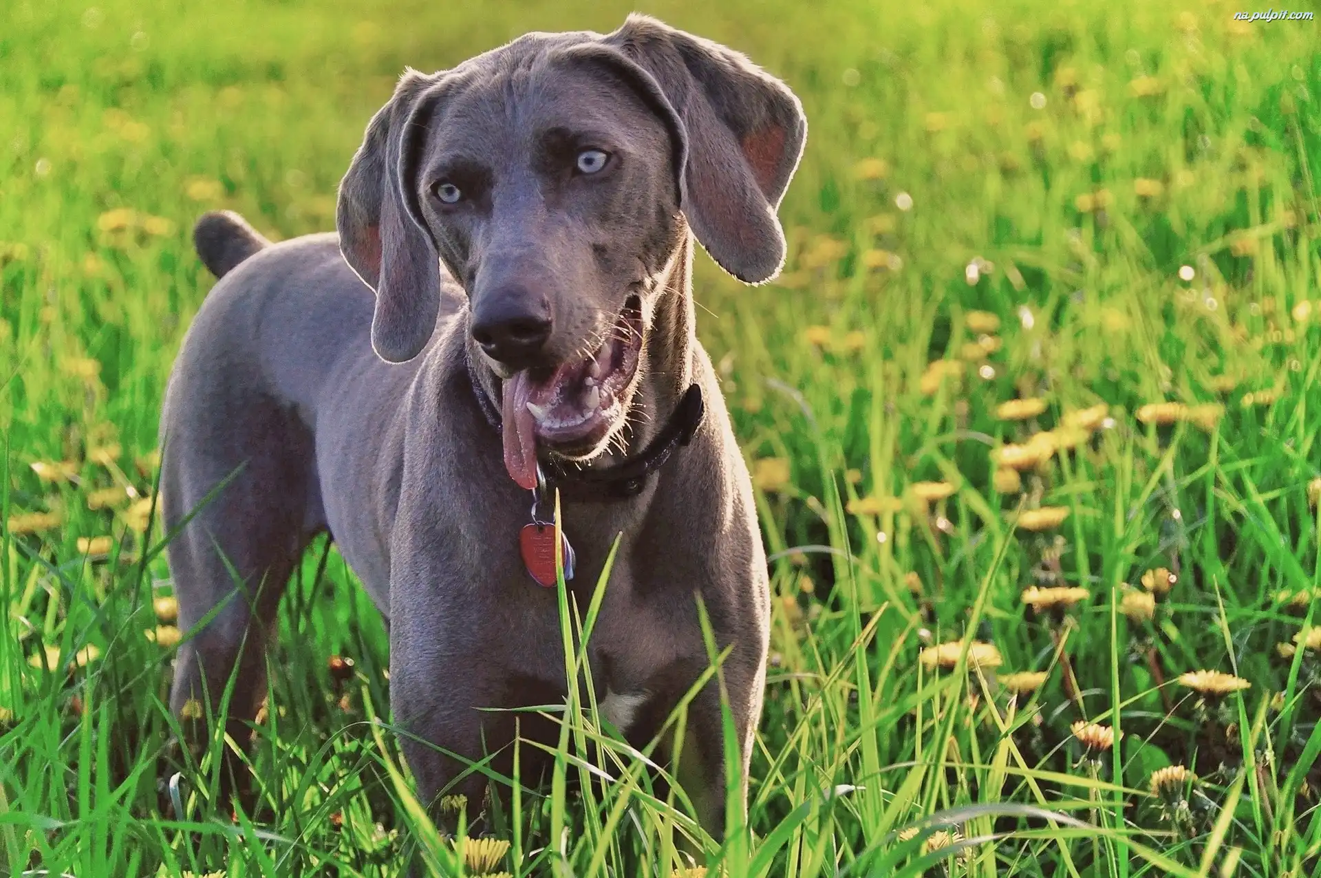 umaszczenie, Wyżeł weimarski, szare Szczeniak, Psy, Wyżeł weimarski Wyżeł weimarski Magnolie, Pies, Wyżeł weimarski, Rozmycie, Kwiaty Pies, Głowa Trawa, Wyżeł, Weimarski