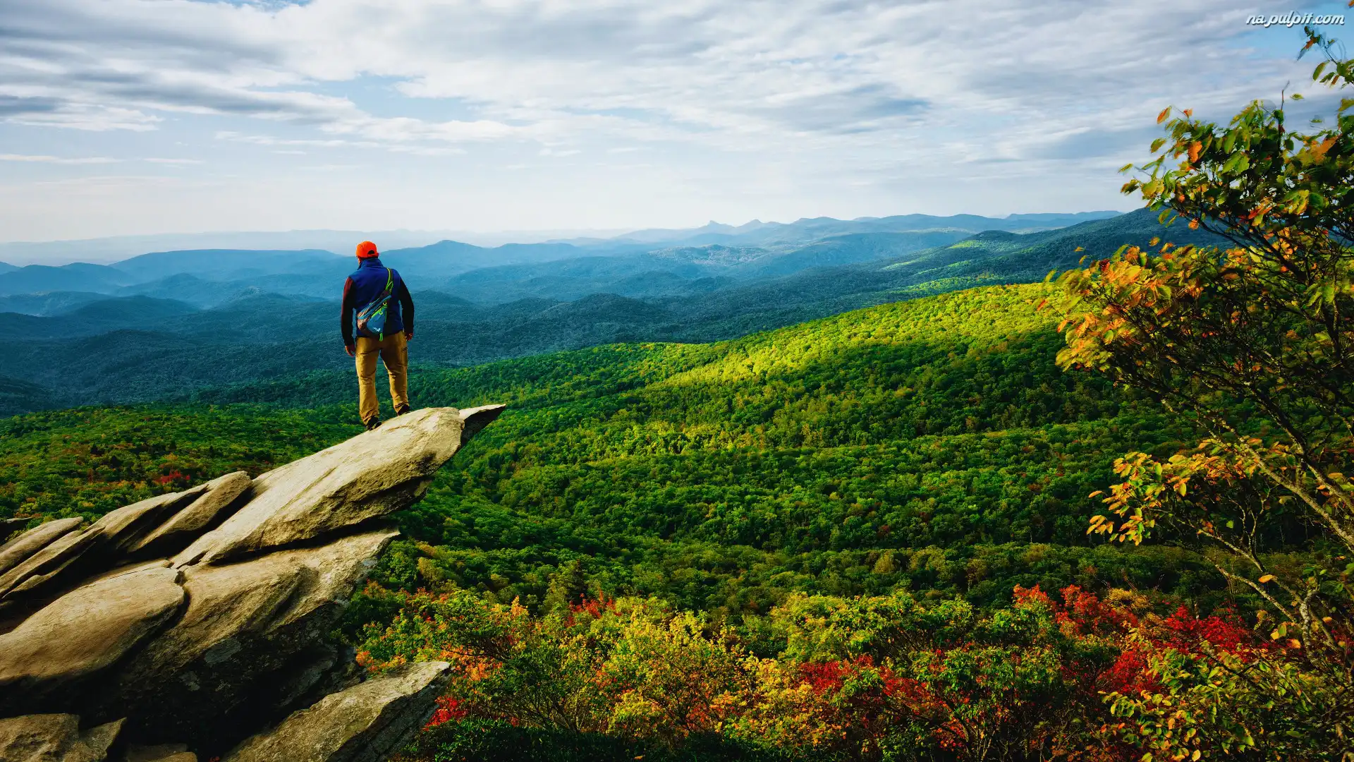 Człowiek, Wzgórza, Skała, Lasy, Zielone, Góry, Drzewa