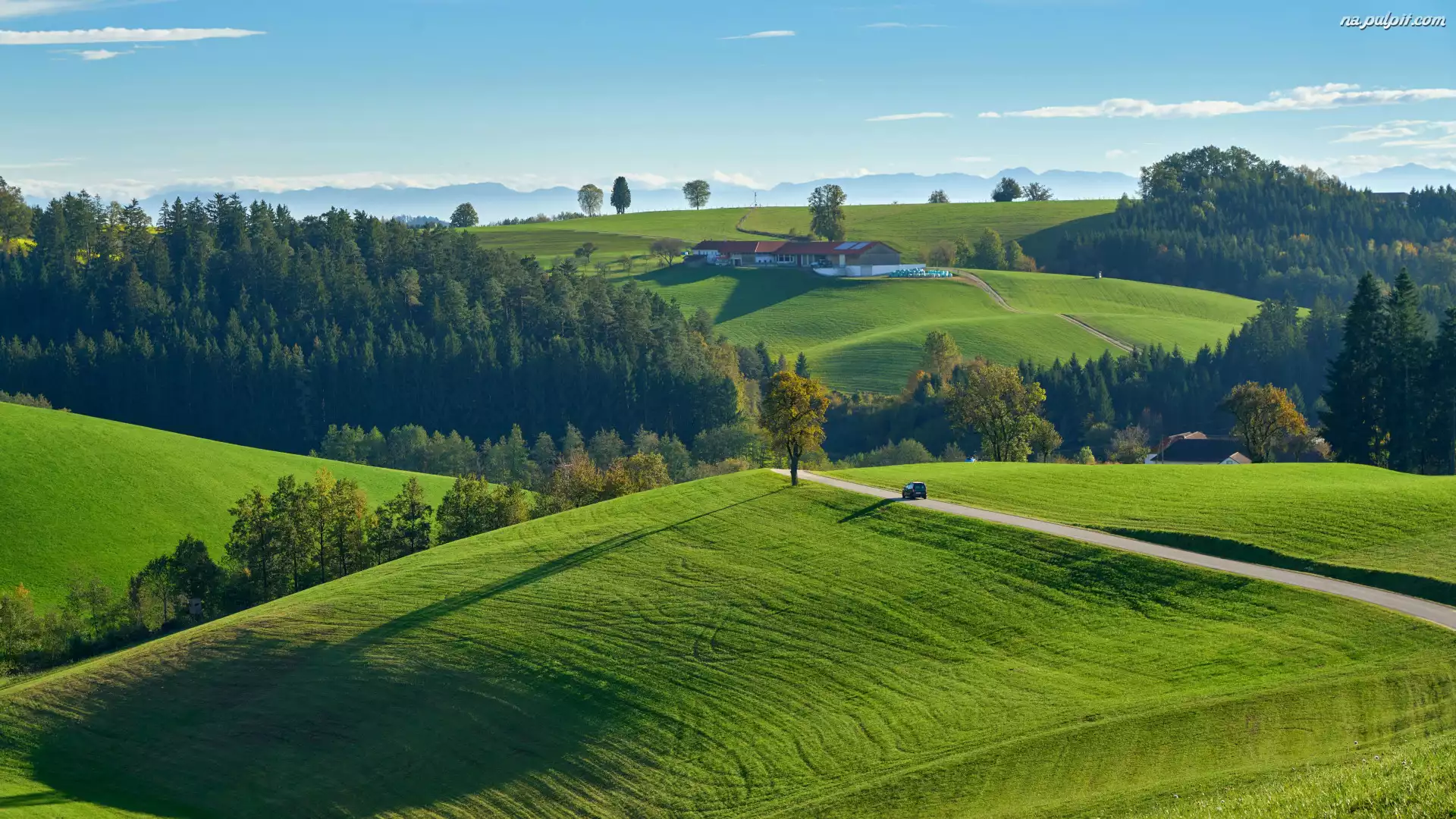 Pola, Domy, Drzewa, Wzgórza, Drogi, Lasy, Łąki Na Pulpit