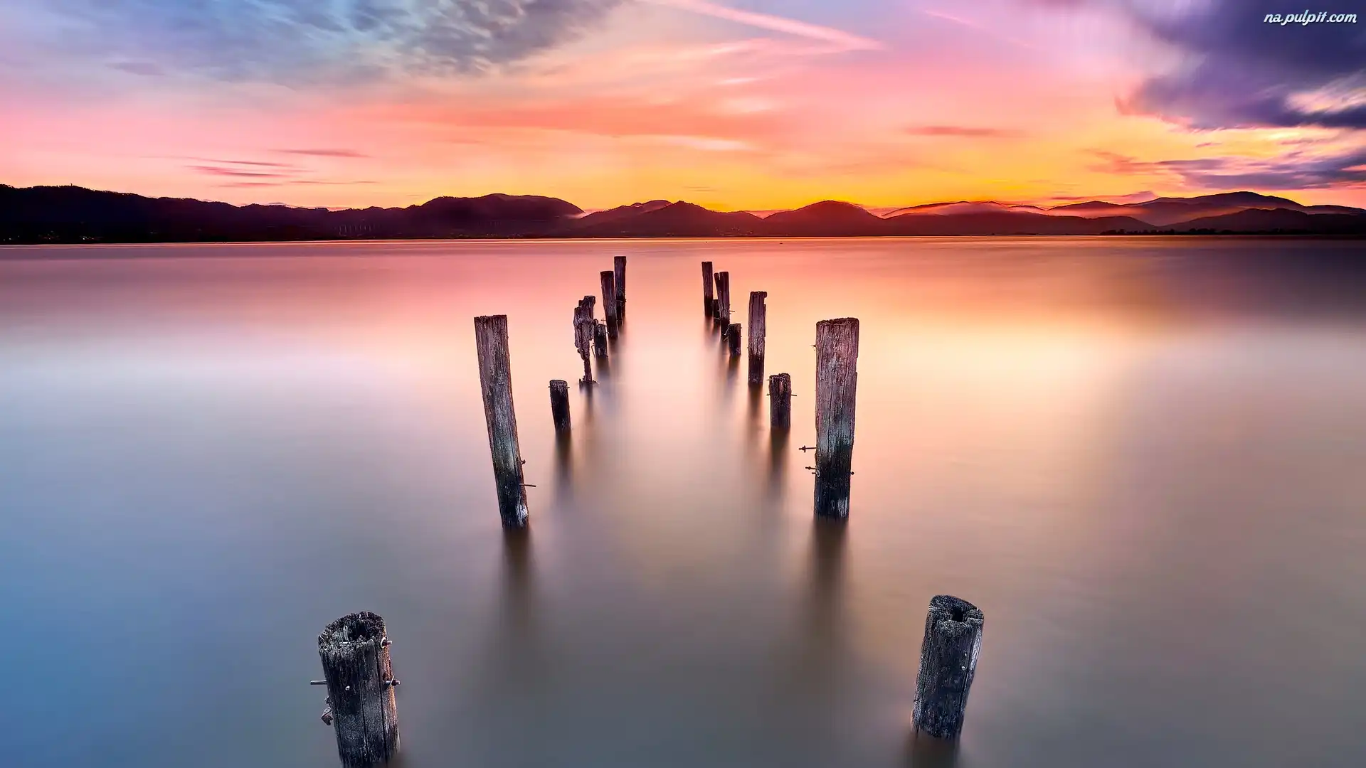 Włochy Jezioro, Wzgórza, Prowincja Lucca, Jezioro, Pale, Zachód słońca, Lake Massaciuccoli Na Pulpit |